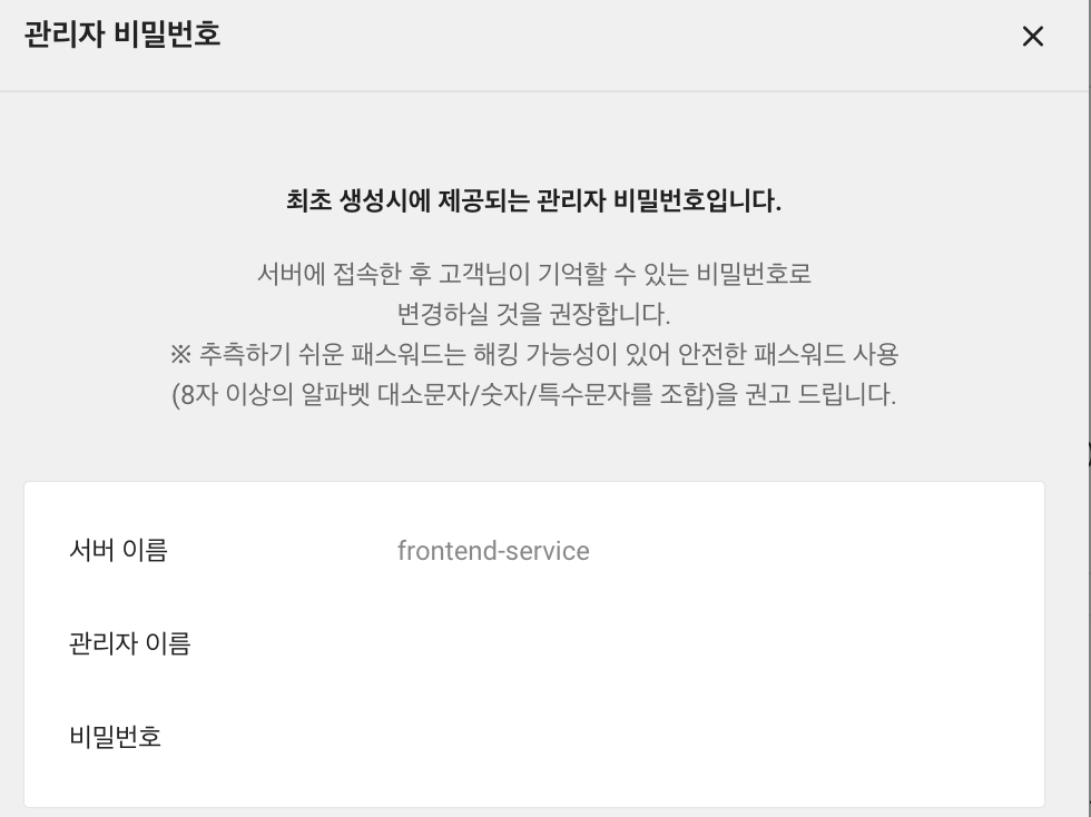 - 그러면 password 를 입력하라고 하는데, 서버 관리 및 정보 > 관리자 비밀번호를 클릭하면 아래처럼 나와있다.