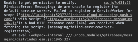 이는 firebase-messaging-sw.js 파일이 없어서 생긴 에러입니다. firebase 이벤트를 수신하기 위해서는 최상위에 firebase-messaging-sw.js를 생성하고, 여기에 서비스 워커를 정의해야 합니다. 그럼 Nuxt.js 프로젝트에서는 static 폴더에 생성해야 되겠죠? static 폴더에 firebase-messaging-sw.js 파일을 생성해 주고, 아래 내용을 입력해 주세요.