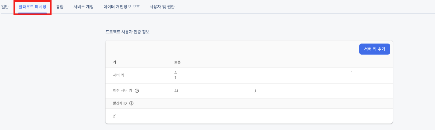 탭에서 클라우드 메시징을 선택하면, 클라우드 메시징을 위한 여러 정보들이 나옵니다. 이 정보들 역시 기억해 주세요.