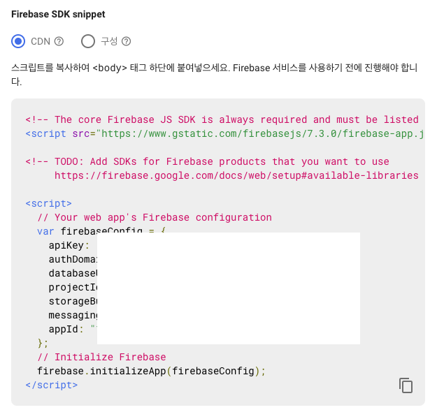 하단으로 내리면, Firebase SDK snippet 부분이 보입니다. 이는 firebase 서비스를 위한 정보들이므로 따로 메모해 두는 것을 추천합니다.